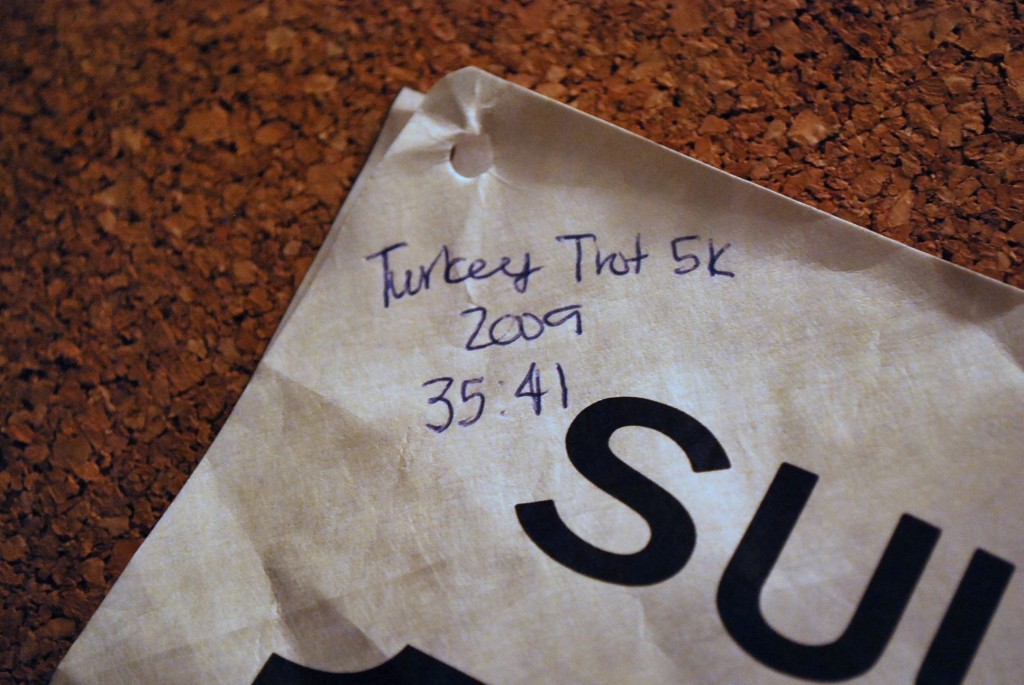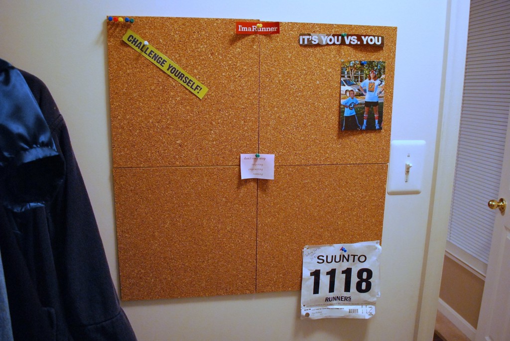 I also seem to be super hung up on my times for my races. It was a real stumbling block for me in the beginning. I thought I was supposed to run a certain speed in order to be considered a “real” runner. So, I hung up my race bibs with my times written on them to remind myself that finishing is the only thing I have to do. Times are going to change, but I will always have to finish once I start.